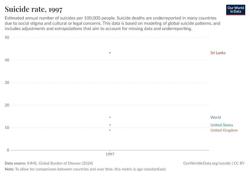“Data Page: Suicide rate”, part of the following publication: Esteban Ortiz-Ospina and Max Roser (2016) - “Global Health”. Data adapted from IHME, Global Burden of Disease. Retrieved from https://auto-epoch.owid.pages.dev:8789/20250909-093708/grapher/suicide-death-rates.html [online resource] (archived on September 9, 2025).How to cite this data