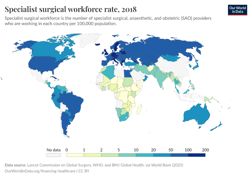 “Data Page: Specialist surgical workforce rate”. Our World in Data (2025). Data adapted from Lancet Commission on Global Surgery, WHO, and BMJ Global Health, via World Bank. Retrieved from https://auto-epoch.owid.pages.dev:8789/20250916-102301/grapher/surgeons-per-100000.html [online resource] (archived on September 16, 2025).How to cite this data