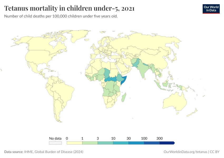 IHME, Global Burden of Disease (2024) – with minor processing by Our World in Data. “Tetanus mortality in children under-5” [dataset]. IHME, Global Burden of Disease, “Global Burden of Disease - Deaths and DALYs” [original data]. Retrieved November 1, 2025 from https://auto-epoch.owid.pages.dev:8789/20250909-093708/grapher/tetanus-mortality-in-children-under-5.html (archived on September 9, 2025).