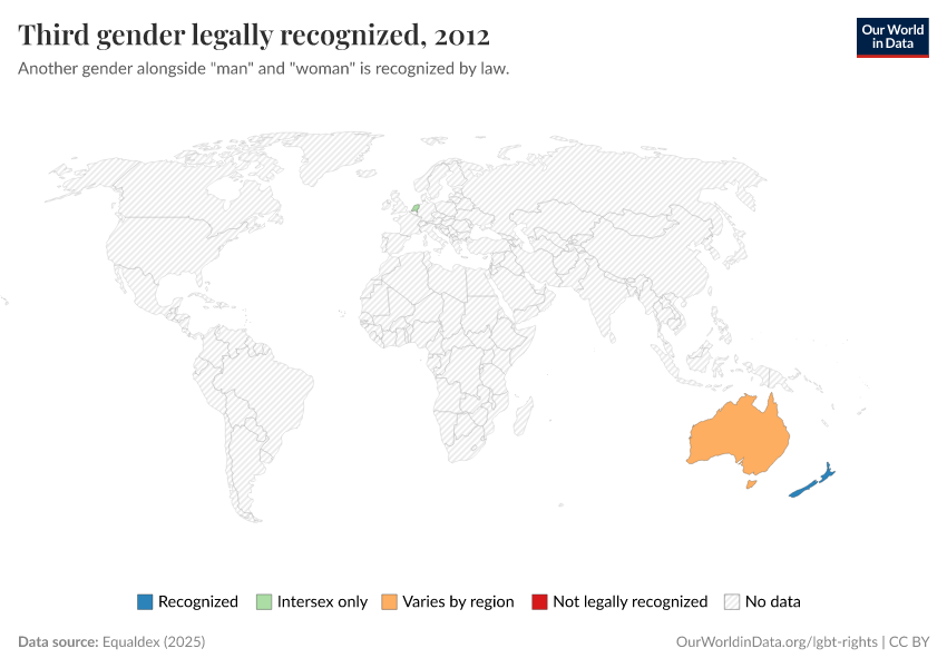 “Data Page: Third gender legally recognized”, part of the following publication: Bastian Herre and Pablo Arriagada (2023) - “LGBT+ Rights”. Data adapted from Equaldex. Retrieved from https://auto-epoch.owid.pages.dev:8789/20250909-093708/grapher/third-gender-recognition-equaldex.html [online resource] (archived on September 9, 2025).How to cite this data