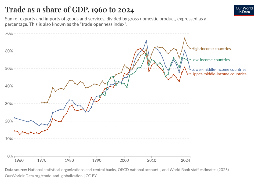“Data Page: Trade as a share of GDP”. Our World in Data (2025). Data adapted from National statistical organizations and central banks, OECD national accounts, and World Bank staff estimates. Retrieved from https://auto-epoch.owid.pages.dev:8789/20250916-100934/grapher/trade-as-share-of-gdp.html [online resource] (archived on September 16, 2025).