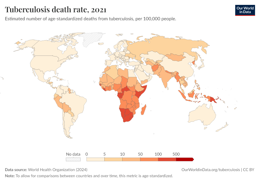 “Data Page: Tuberculosis death rate”, part of the following publication: Esteban Ortiz-Ospina and Max Roser (2016) - “Global Health”. Data adapted from World Health Organization. Retrieved from https://auto-epoch.owid.pages.dev:8789/20250909-093708/grapher/tuberculosis-death-rate-age-standardized.html [online resource] (archived on September 9, 2025).How to cite this data