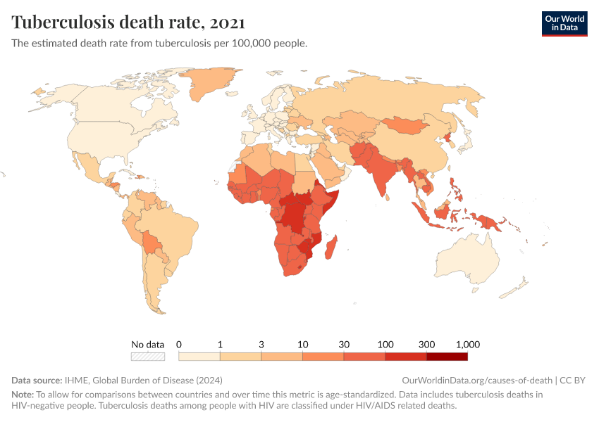 IHME, Global Burden of Disease (2024) – with minor processing by Our World in Data. “Tuberculosis death rate” [dataset]. IHME, Global Burden of Disease, “Global Burden of Disease - Deaths and DALYs” [original data]. Retrieved November 1, 2025 from https://auto-epoch.owid.pages.dev:8789/20250909-093708/grapher/tuberculosis-death-rates.html (archived on September 9, 2025).