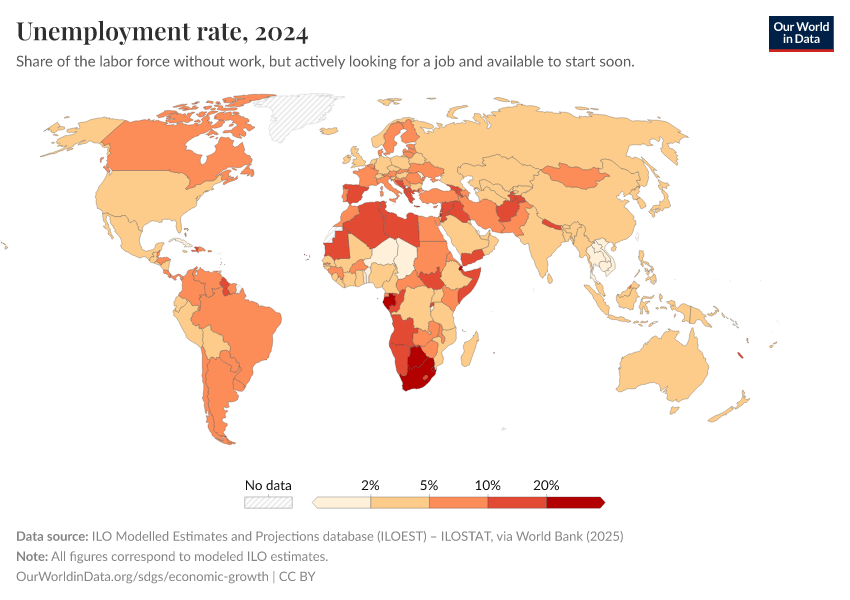 “Data Page: Unemployment rate”. Our World in Data (2025). Data adapted from ILO Modelled Estimates and Projections database (ILOEST) – ILOSTAT, via World Bank. Retrieved from https://auto-epoch.owid.pages.dev:8789/20250926-154625/grapher/unemployment-rate.html [online resource] (archived on September 26, 2025).How to cite this data