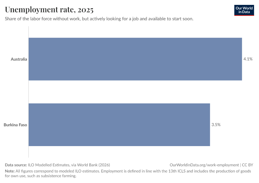 ILO Modelled Estimates, via World Bank (2026) – processed by Our World in Data. “Unemployment rate – ILO” [dataset]. ILO Modelled Estimates, via World Bank, “World Development Indicators 125” [original data]. Retrieved March 6, 2026 from https://auto-epoch.owid.pages.dev:8789/20260304-094028/grapher/unemployment-rate.html (archived on March 4, 2026).