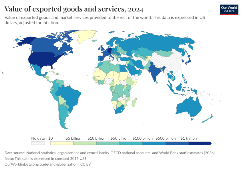 “Data Page: Value of exported goods and services”. Our World in Data (2026). Data adapted from National statistical organizations and central banks, OECD national accounts, and World Bank staff estimates. Retrieved from https://auto-epoch.owid.pages.dev:8789/20260112-111535/grapher/value-of-exported-goods-and-services.html [online resource] (archived on January 12, 2026).How to cite this data