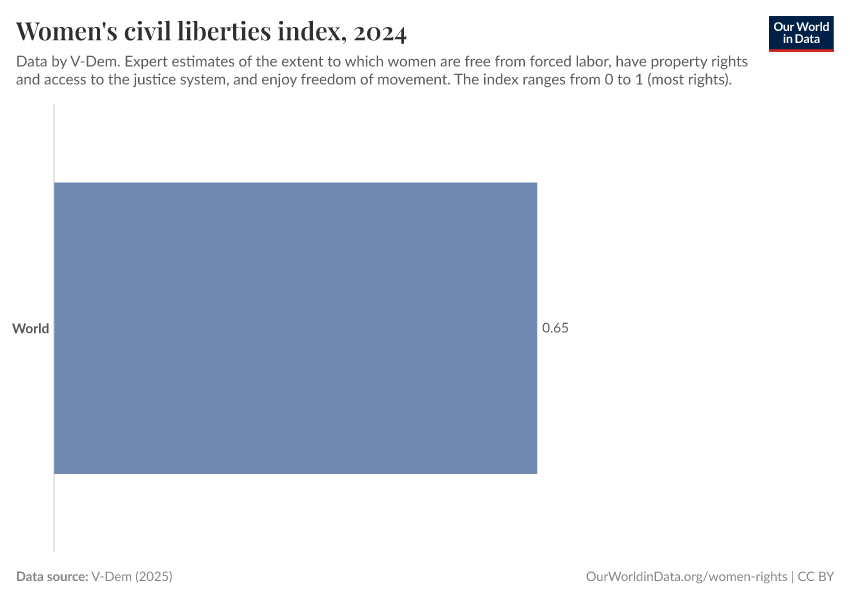 V-Dem (2025) – processed by Our World in Data. “Women's civil rights index – V-Dem” [dataset]. V-Dem, “Democracy report v15” [original data]. Retrieved November 1, 2025 from https://auto-epoch.owid.pages.dev:8789/20250925-233948/grapher/women-civil-liberties-index.html (archived on September 25, 2025).