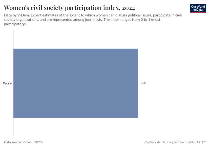 “Data Page: Women's civil society participation index”, part of the following publication: Bastian Herre, Lucas Rodés-Guirao, and Esteban Ortiz-Ospina (2013) - “Democracy”. Data adapted from V-Dem. Retrieved from https://auto-epoch.owid.pages.dev:8789/20250925-233948/grapher/women-civil-society-participation-index.html [online resource] (archived on September 25, 2025).