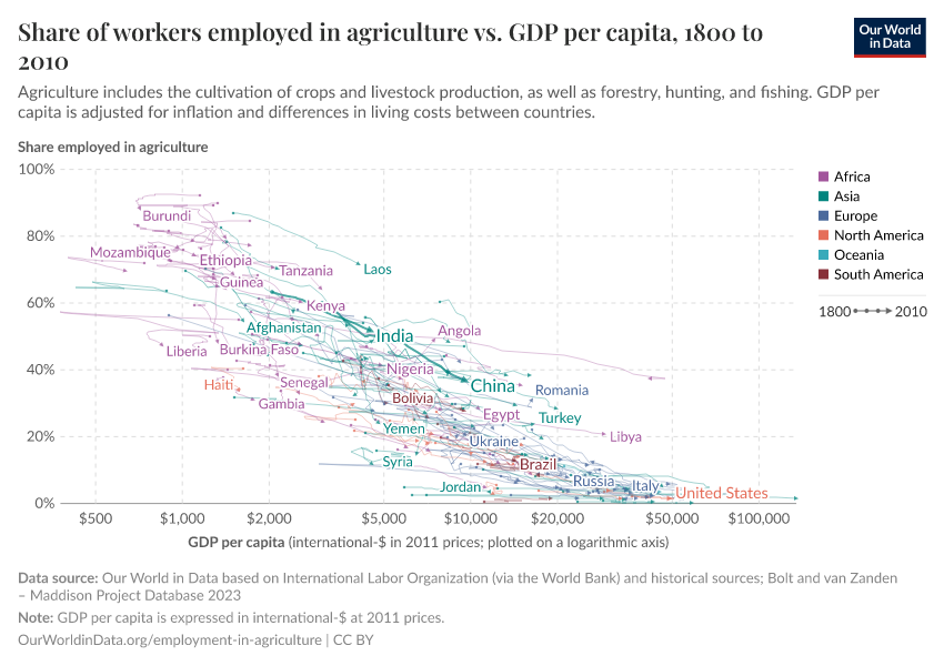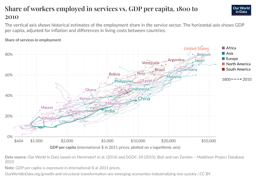 One way to study the process of “structural transformation” across countries is to track how employment changes across sectors in the economy. The below chart does this, plotting the share of industry in total employment (vertical axis) against GDP per head (horizontal axis). This graph is a “connected scatter plot” — each line shows the trajectory that a country followed over time along these two dimensions. Data is available for a selection of more than 40 countries, across all continents.
