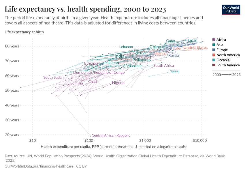 In the chart below, we can see a comparison between life expectancy and per capita healthcare expenditure across countries. The chart shows the change between 1995 and the latest year.