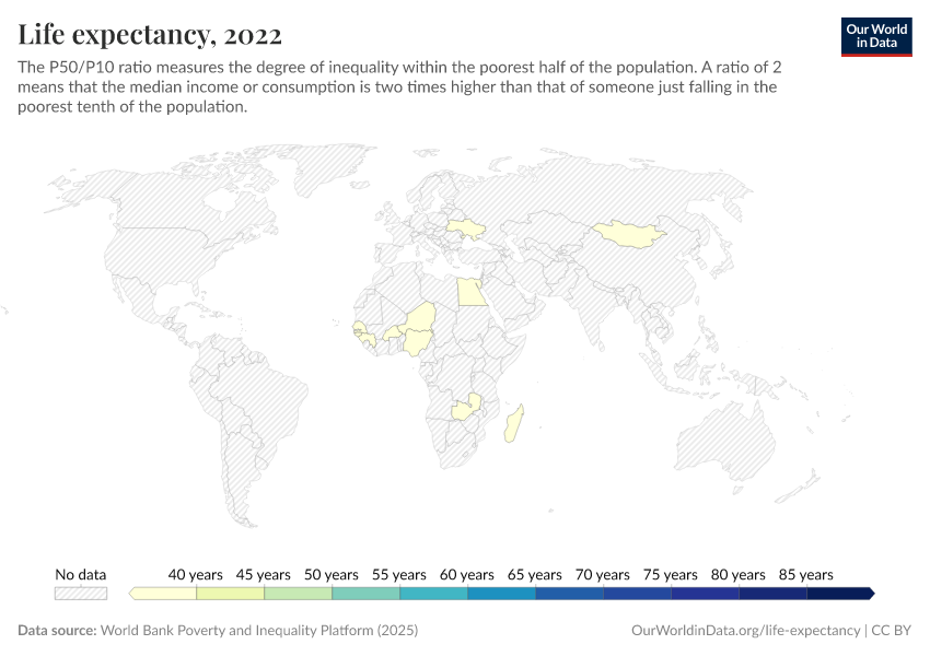 The map view shows a comparison of life expectancy across countries. As you can see, although the global disparity in life expectancy has reduced substantially, there are still huge differences between countries.