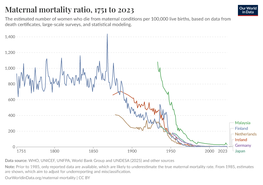 Historical data on maternal mortality, particularly from high-income countries, shows significant reductions over time.