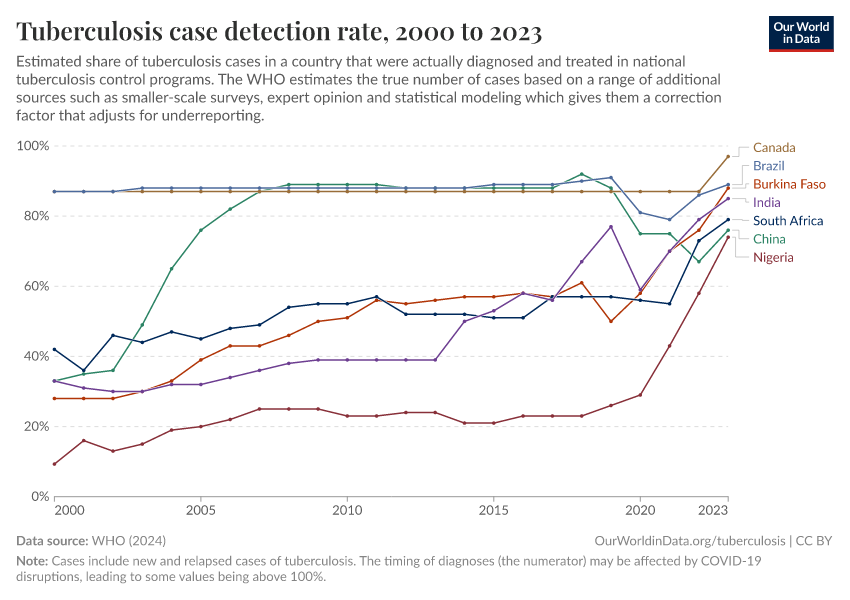 In the chart below, you can see rises in detection rates for tuberculosis in different countries. This is again helped by efforts such as The Global Fund and PEPFAR.
