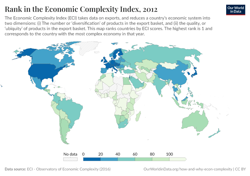 The following chart shows ECI rankings for all countries in the world, over time.