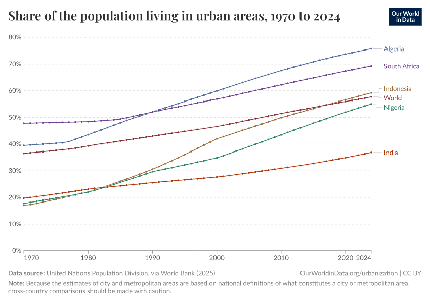 More and more people are moving to cities, particularly in some of the world's hottest and most vulnerable parts. As the chart shows, urban populations are growing rapidly in many countries across the hotter parts of the planet. Finding effective ways to keep cities cool is crucial to protect billions from extreme heat.