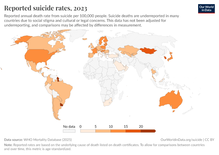 The map below shows the reported suicide rate in each country in the WHO Mortality Database (WHO MDB). It republishes reported data from all countries that have registered at least 65% of all deaths with a cause of death.