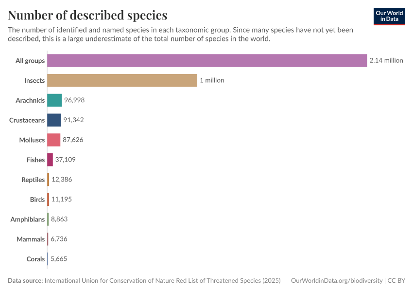 The IUCN Red List tracks the number of described species and updates this figure annually based on the latest work of taxonomists. In 2022, it listed 2.16 million species on the planet. In the chart, we see the breakdown across a range of taxonomic groups — 1.05 million insects, over 11,000 birds, over 11,000 reptiles, and over 6,000 mammals.