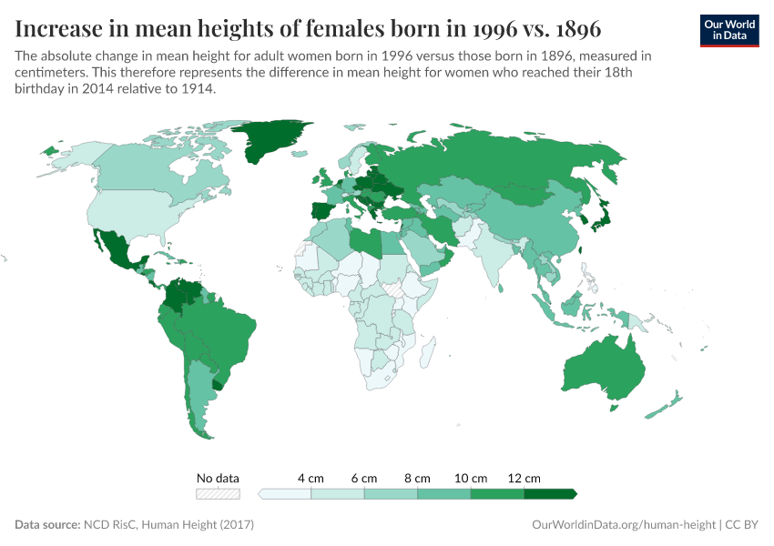 People today are taller, on average, than their ancestors were 100 years ago. This is true for every country in the world.