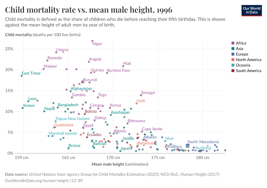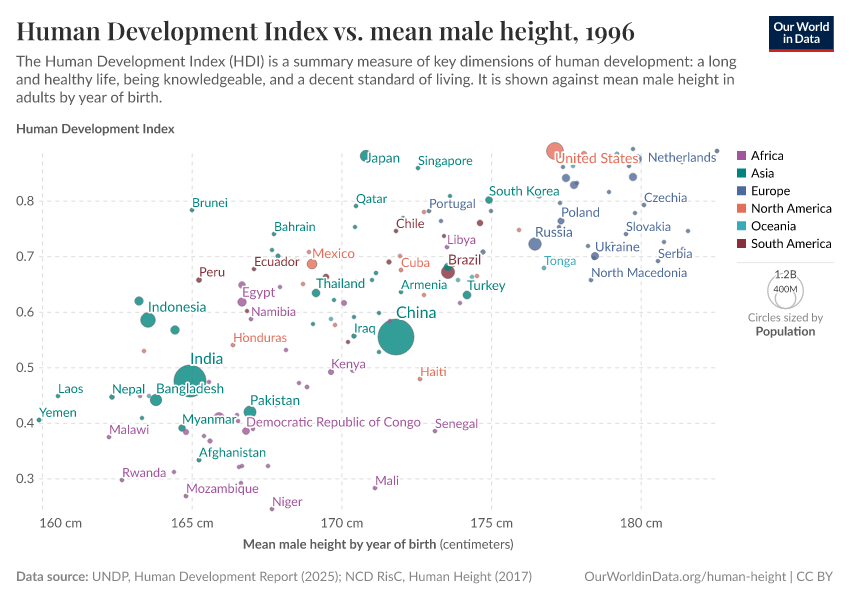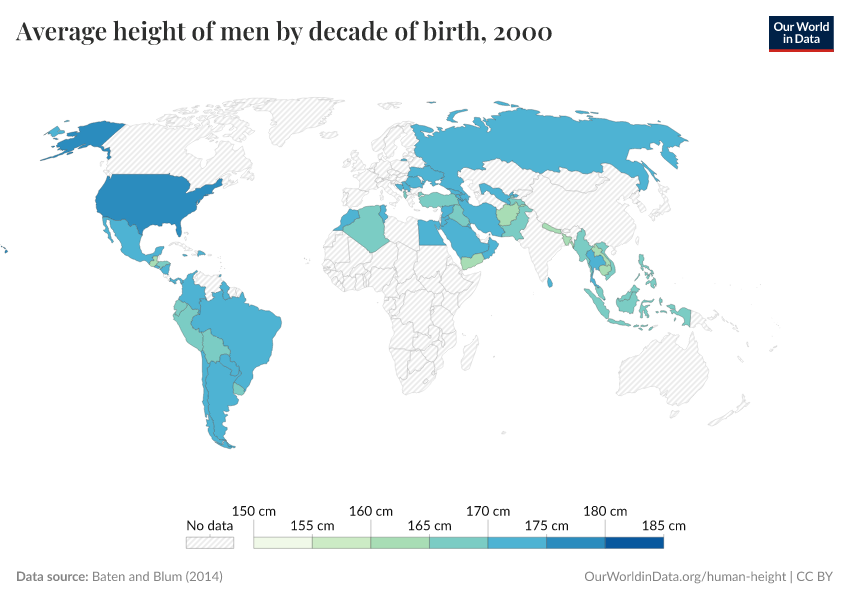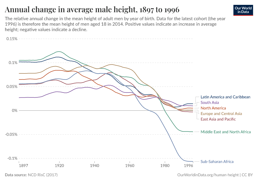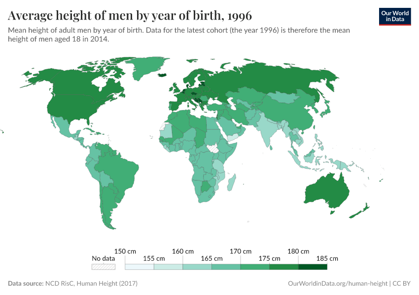 The data shown here comes from a global study, published by the NCD Risk Factor Collaboration (NCD-RisC) in 2016.4 This dataset is based on both demographic and health surveys as well as academic studies. It reports the estimated average (mean) height for adults by their year of birth, meaning that it only includes estimates for those who have reached the age of 18.