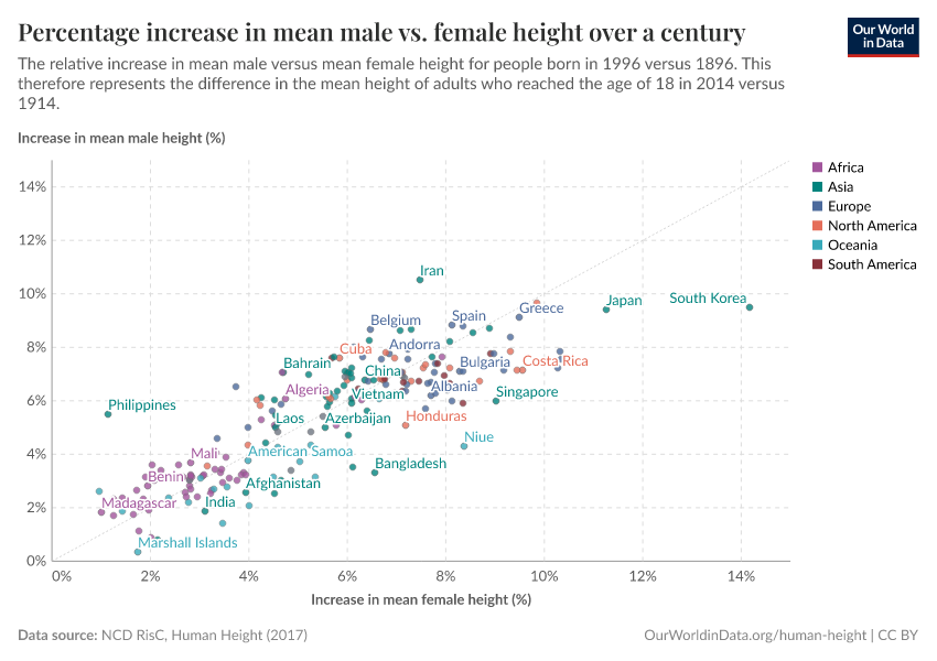 A century ago, South Korean men were on average 18 cm taller than women; this difference fell to 13 cm, meaning that South Korean women saw larger absolute gains in height than South Korean men.