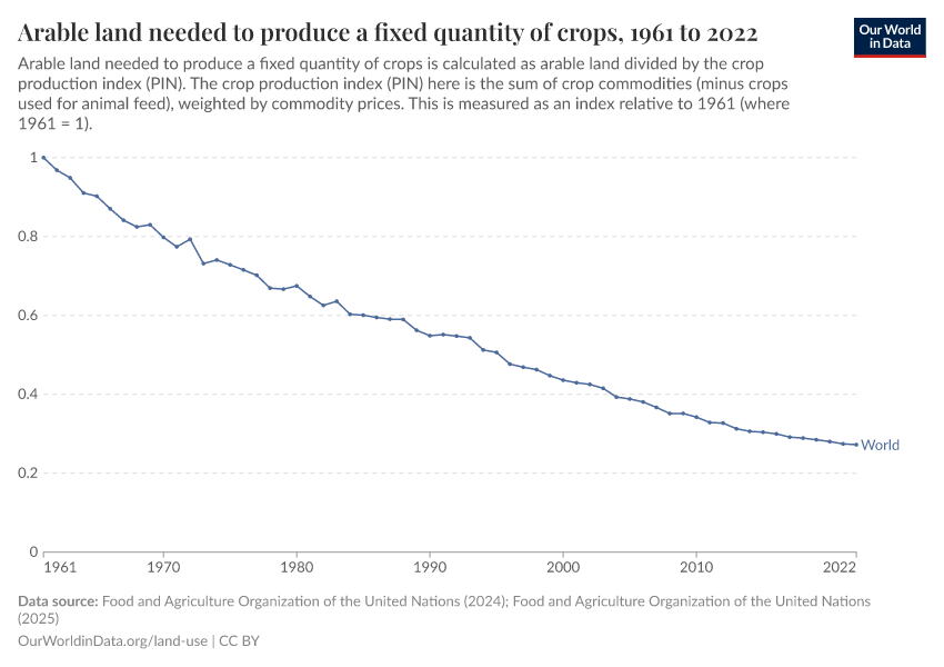 This visualization shows the index of the arable land area needed to produce an equivalent aggregate of crop production relative to the land area needed in 1961, i.e., values in 1961 are equal to 1.0. For example, globally, in 2014, the index value was 0.3; this means only 30% of the arable land area was needed to produce the same quantity of crops relative to 1961. 70% less land was needed.