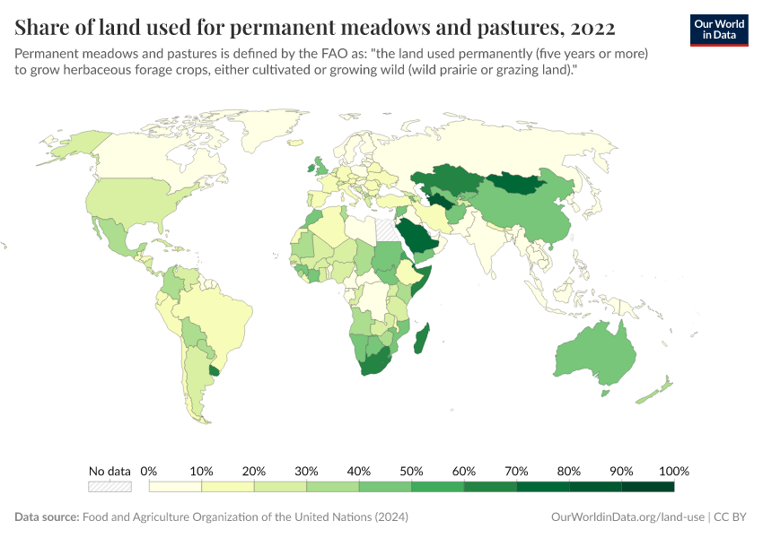 For most countries, the majority of agricultural land is used for livestock rearing in the form of pastureland. In the map here we see the share of permanent meadow and pasture as a percentage of total land area.