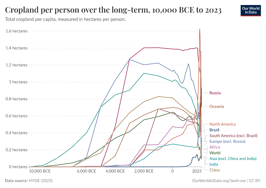 The visualization here shows the change in the average cropland use per person over the long term (since 10,000 BCE), measured in hectares per person.