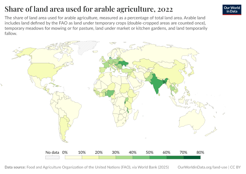 There are two main uses of agricultural land: arable farming (which is land dedicated to growing crops) and pastureland (which includes meadows and pastures used for livestock rearing). In the chart here we see a global map of land used for arable agriculture (as a share of total land area).
