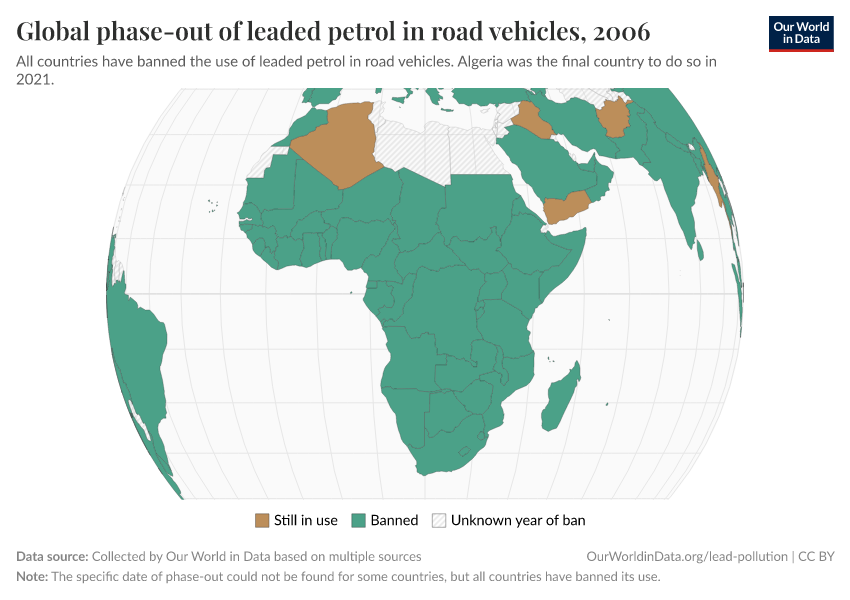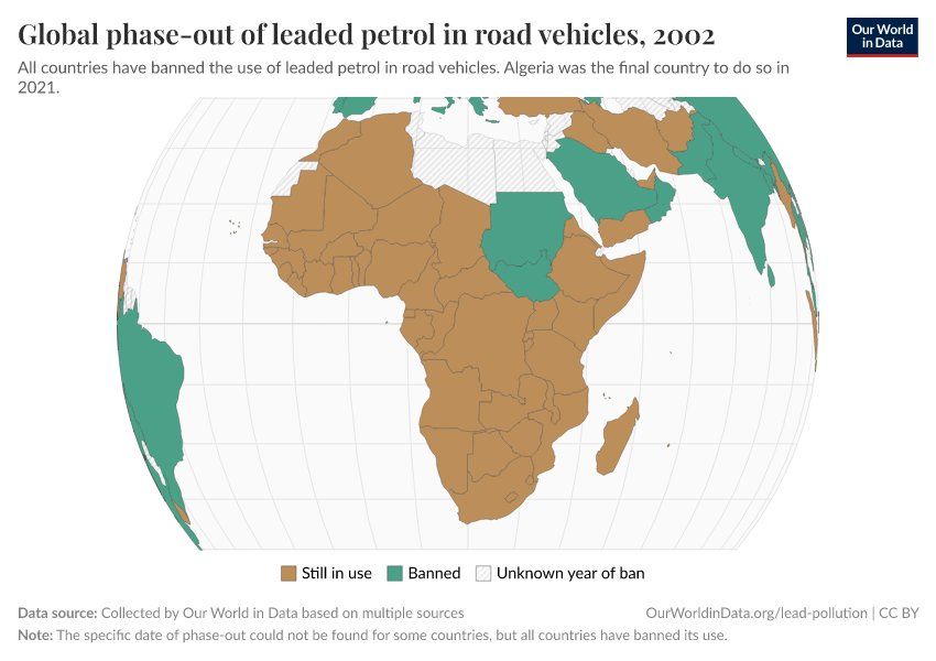 It took long to react, but once the evidence was there and the first country banned it is staggering how quickly some of this progress was made. In 2002, the United Nations Environment Programme (UNEP) launched a programme to eliminate leaded gasoline in road vehicles globally.5 In the map below we see the status of leaded gasoline in Sub-Saharan Africa in 2002. It was still in use in nearly every country. By 2006, it had been banned everywhere in the region. Within only a few years it had been completely eliminated.