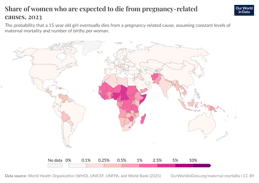 In the chart, we see estimates of the share of women who would die from maternal causes in their lifetime.