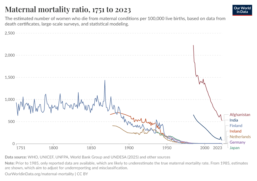 The decline of maternal mortality in Finland, for example, began in the middle of the 19th century and didn’t reach today’s low level more than a century later. In contrast, India and Afghanistan, for example, have achieved large declines much later, but in a shorter amount of time.
