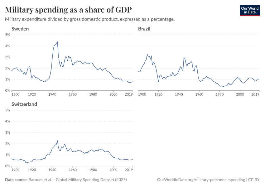 How much do countries spend on the military in the absence of major violent conflict? The chart shown here focuses on Sweden, Brazil and Switzerland. As we can see, despite broad reductions in recent years, all these countries have kept levels of military spending close to 1% of GDP. In all these countries the level today is similar to what it was at the turn of the 20th century.