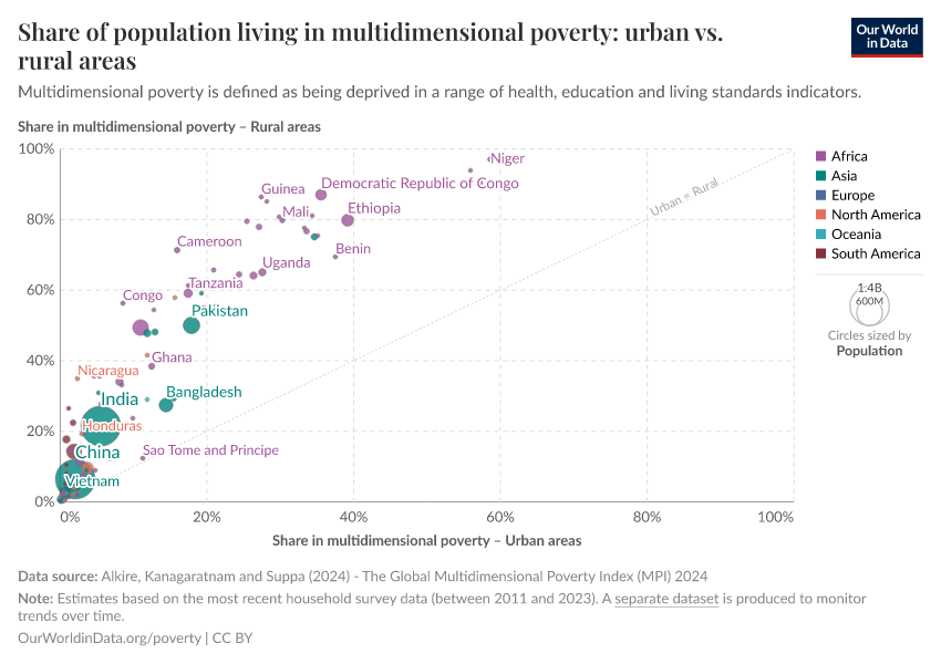 The chart shows that the share of people living in multidimensional poverty is higher in rural areas than in urban areas, but the extent of this gap varies considerably across countries.