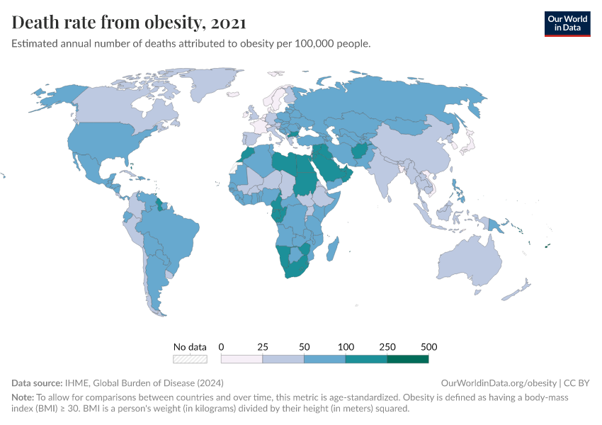 In the map here you can see differences in death rates from obesity across the world, per 100,000 people in the population.