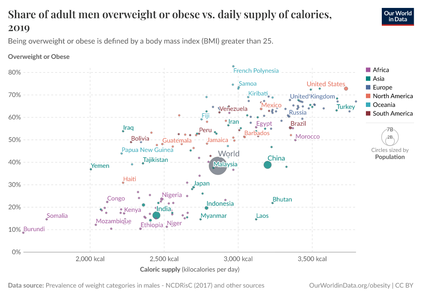 In the chart here, we see the relationship between the share of men who are overweight or obese versus the daily average supply of kilocalories per person.