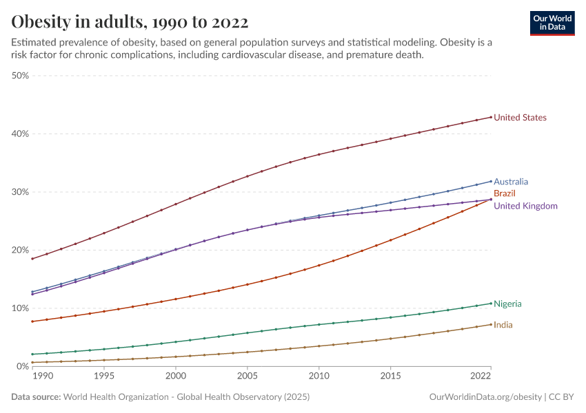Hannah Ritchie and Max Roser (2017) - “Obesity” Published online at OurWorldinData.org. Retrieved from: 'https://auto-epoch.owid.pages.dev/obesity' [Online Resource]BibTeX citation