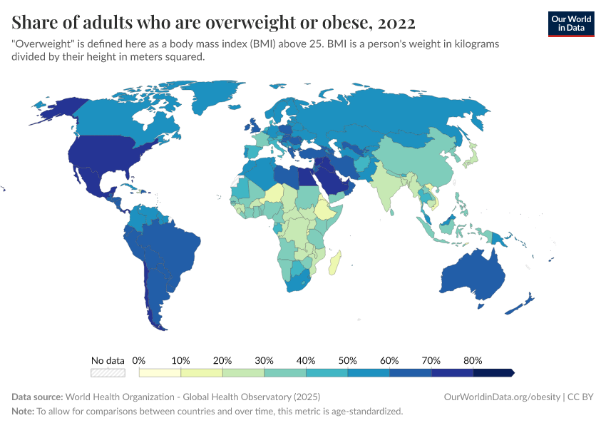 In the map here we see the share of adults who are overweight or obese across countries.