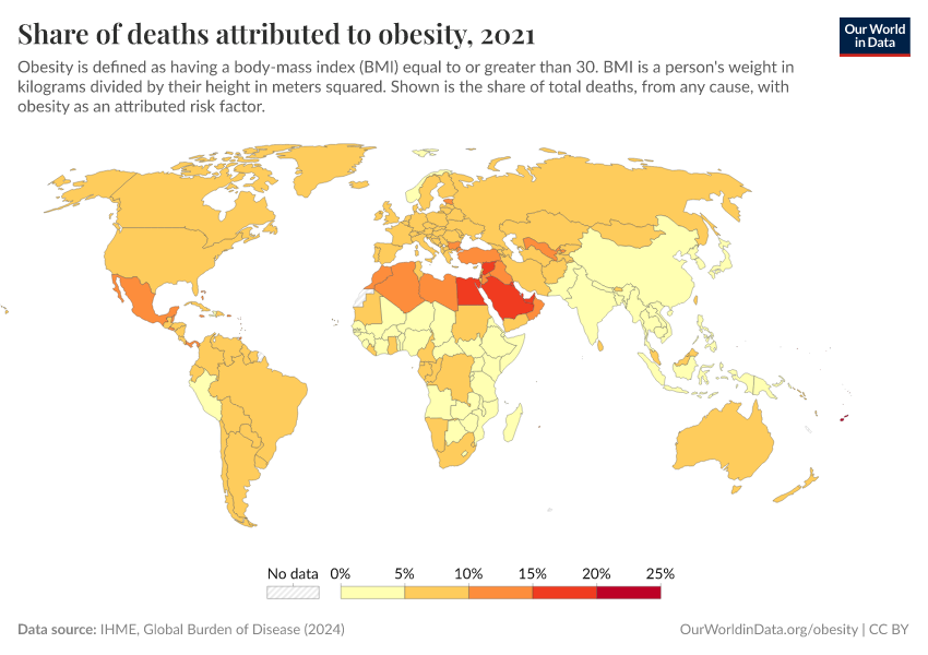 In 2019, in most high-income countries, the share of deaths attributed to obesity was in the range of 8 to 10%. In many middle-income countries, this share was almost twice as high.