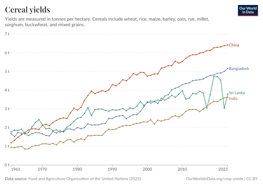 I’ve written previously about the benefits of agricultural technologies such as fertilizers, better seeds, pesticides, and irrigation for food production, poverty alleviation, and sparing natural habitat. These technologies have played a massive role in the dramatic rise in crop yields seen in countries like Sri Lanka, India, China, and Bangladesh. See the chart below.