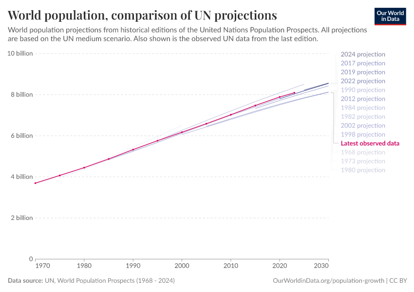 Hannah Ritchie (2023) - “The UN has made population projections for more than 50 years – how accurate have they been?” Published online at OurWorldinData.org. Retrieved from: 'https://auto-epoch.owid.pages.dev/population-projections' [Online Resource]BibTeX citation
