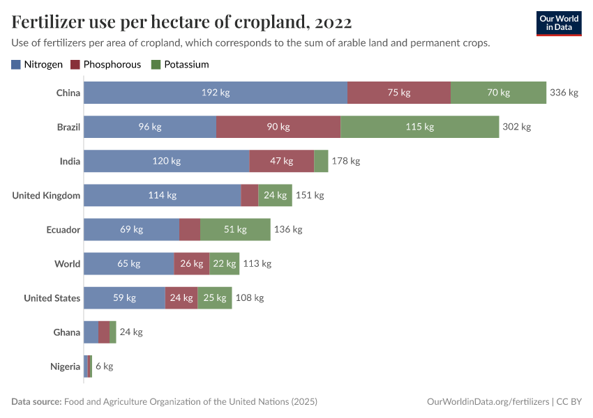 If a soil is lacking nutrients naturally we can add our own. This can be in the form of synthetic fertilizers, or organic additions such as manure. There are very large differences in how much fertilizer is applied across the world. We see this in the charts below: first as a map of average fertilizer use per hectare of cropland; and second, with the breakdown by nutrient in the bar chart.