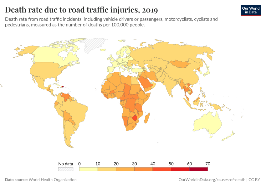 Data for this indicator is shown in the first chart in the series of interactive visualizations. The second chart shows the absolute number of road traffic deaths for additional context.