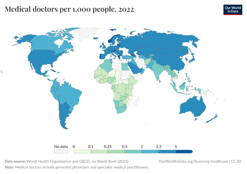 Health worker density is the size of the health workforce per 1,000 people. It is measured here based on the density of physicians, surgeons, nurses and midwives, dentistry and pharmaceutical personnel.