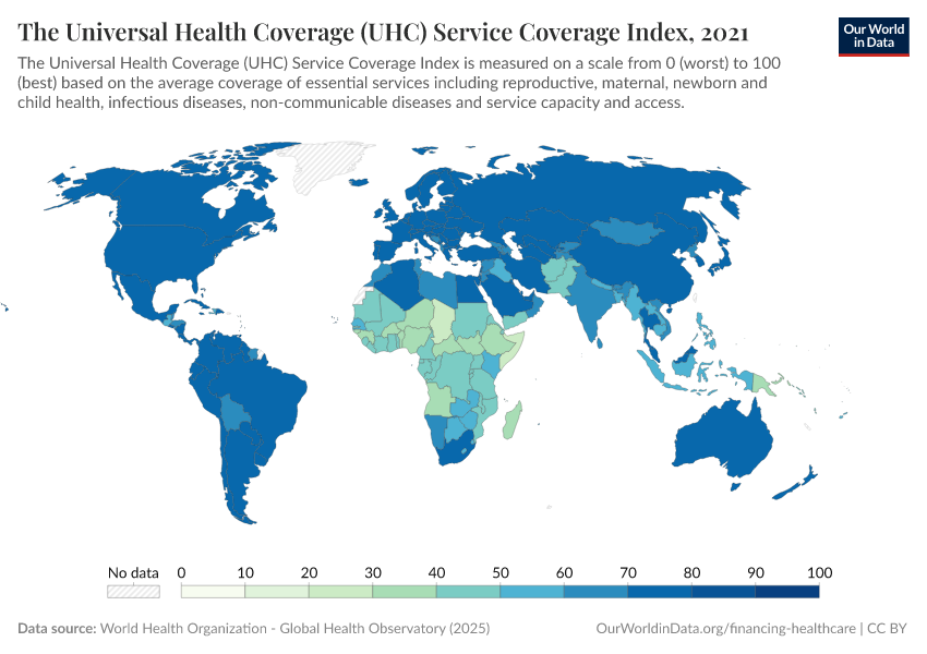 The Universal Health Coverage (UHC) Service Coverage Index is used to track progress on this indicator. The index is on a scale from 0 to 100, where 100 is the optimal value, and calculated from the geometric mean of 14 indicators measuring the coverage of essential services including reproductive, maternal, newborn and child health, infectious diseases, non-communicable diseases and service capacity and access.