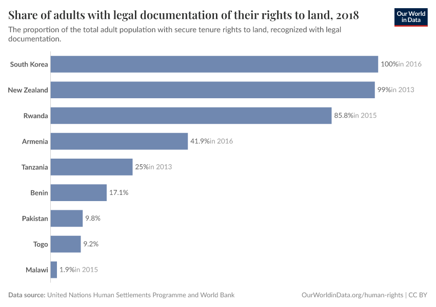 The interactive visualizations show data for this indicator. The first chart shows data on indicator 1.4.2(a) for the share of adults with legal documentation of their rights to land, and the second chart shows data on indicator 1.4.2(b) for the share of individuals who perceive their rights to land as secure.