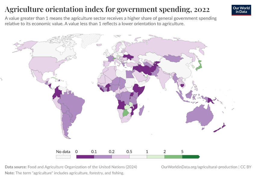 The agriculture orientation index (AOI) is the agriculture share of government expenditures, divided by the agriculture share of GDP.