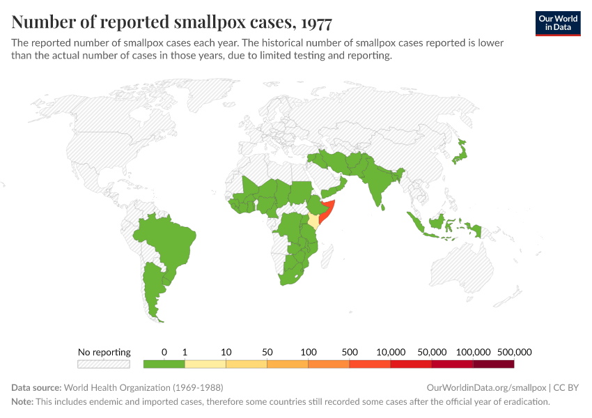 The reported number of smallpox cases between 1920 and 1978 amounted to 11.6 million cases — but that number was certainly smaller than the actual number of cases, although we do not know by how much.