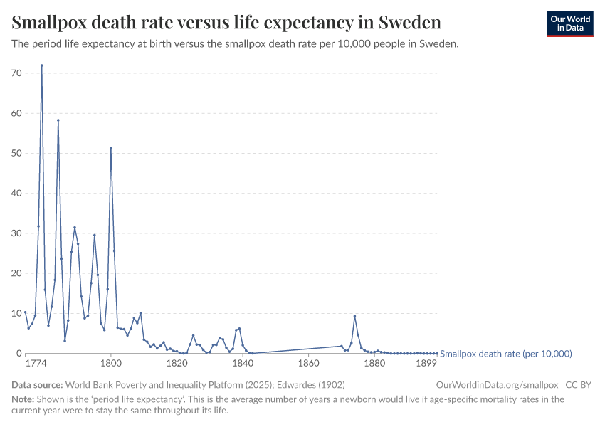 The chart below shows Sweden's life expectancy versus deaths from smallpox from 1774 to 1900.