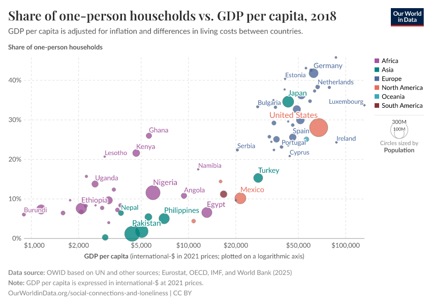 National income per capita and the share of one-person households are strongly correlated: As the chart here shows, people are more likely to live alone in rich countries.