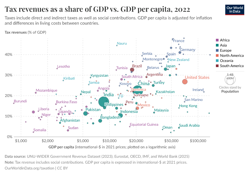 We have already pointed out that rich countries tend to collect much higher tax revenues than poor countries. The visualization provides further evidence of the extent of this correlation.